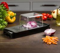 После работы снимите её и очистите зубчики инструмента. Бокс удерживает измельчённые продукты и защищает от разбрызгивания сока (томаты, солёные огурцы). Избавляет от слёз при нарезке лука!